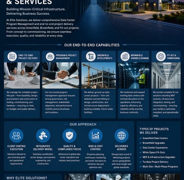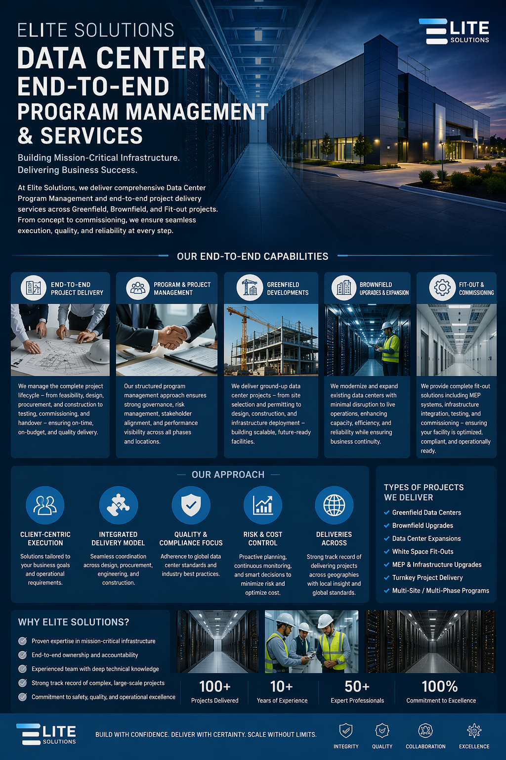 At Elite Solutions, we specialize in delivering end-to-end Data Center Program Management and project execution services that enable businesses to scale with confidence. From Greenfield developments to Brownfield upgrades and fit-out solutions, we bring a structured, reliable, and performance-driven approach to every project.